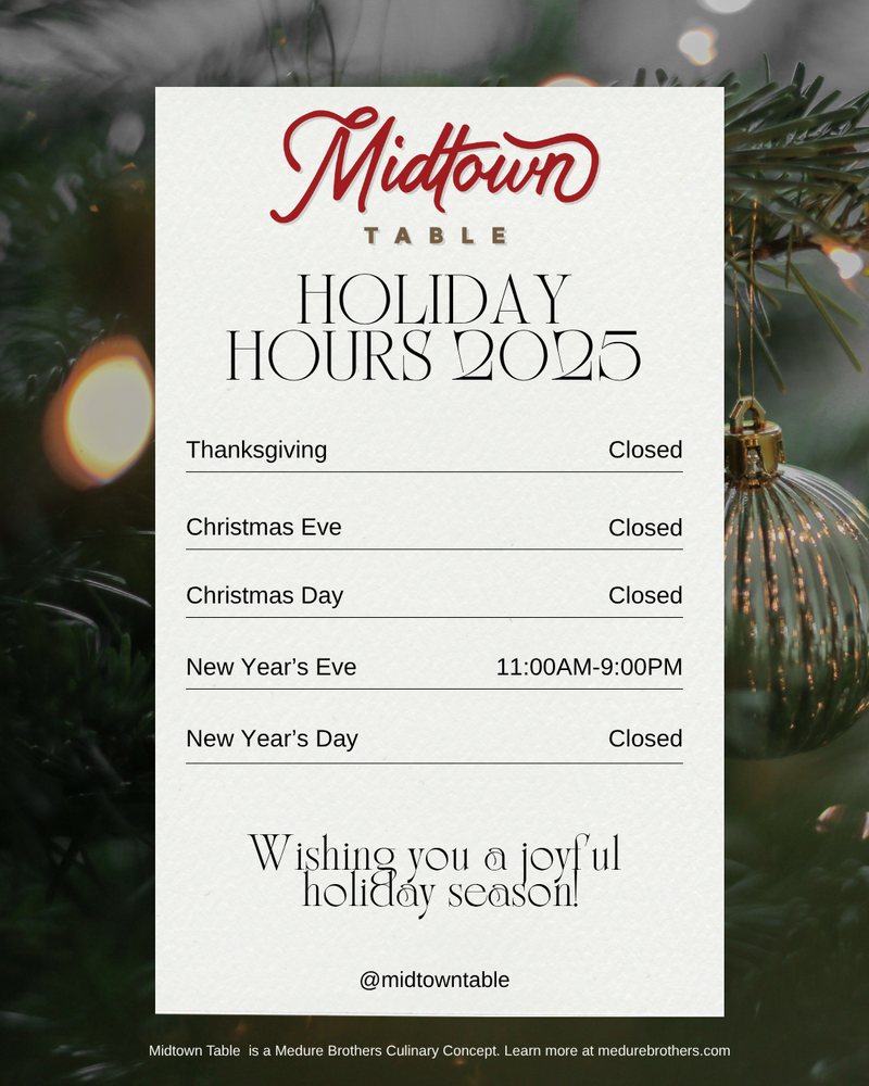 Midtown Table is a local spot where simple ingredients meet thoughtful preparation. As part of the Medure Brothers' culinary concepts, we offer Italian-inspired lunch, dinner, and craft cocktails in a warm, welcoming space.